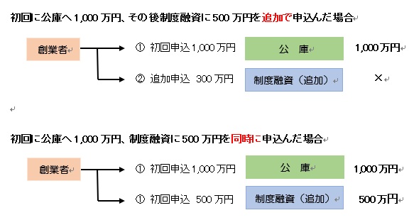 例えば、先に日本政策金融公庫から1,000万円の融資を受けた後、追加で制度融資で500万円の融資を受けようとしても、多くの場合で融資はされません。